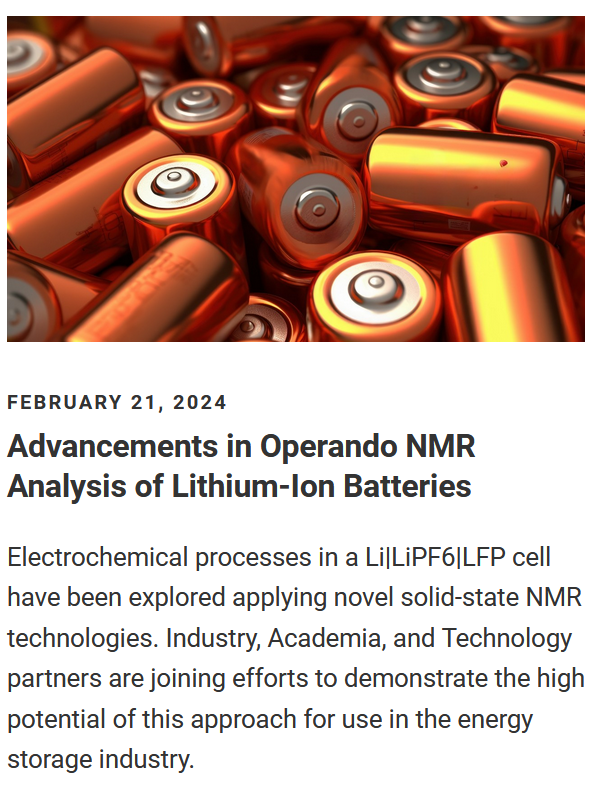 Webinar: Advancements in Operando NMR Analysis of Lithium-Ion Batteries on Wednesday, 21 February 2024, 5 PM CET. Electrochemical processes in a Li|LiPF6|LFP cell have been explored applying novel solid-state NMR technologies. Industry, Academia, and Technology partners are joining efforts to demonstrate the high potential of this approach for use in the energy storage industry. Join Dragonfly Energy, Darmstadt Technical University, ePROBE and BRUKER BioSpin as they discuss about an experimental procedure for routine application of in-situ Solid-State NMR for battery research.