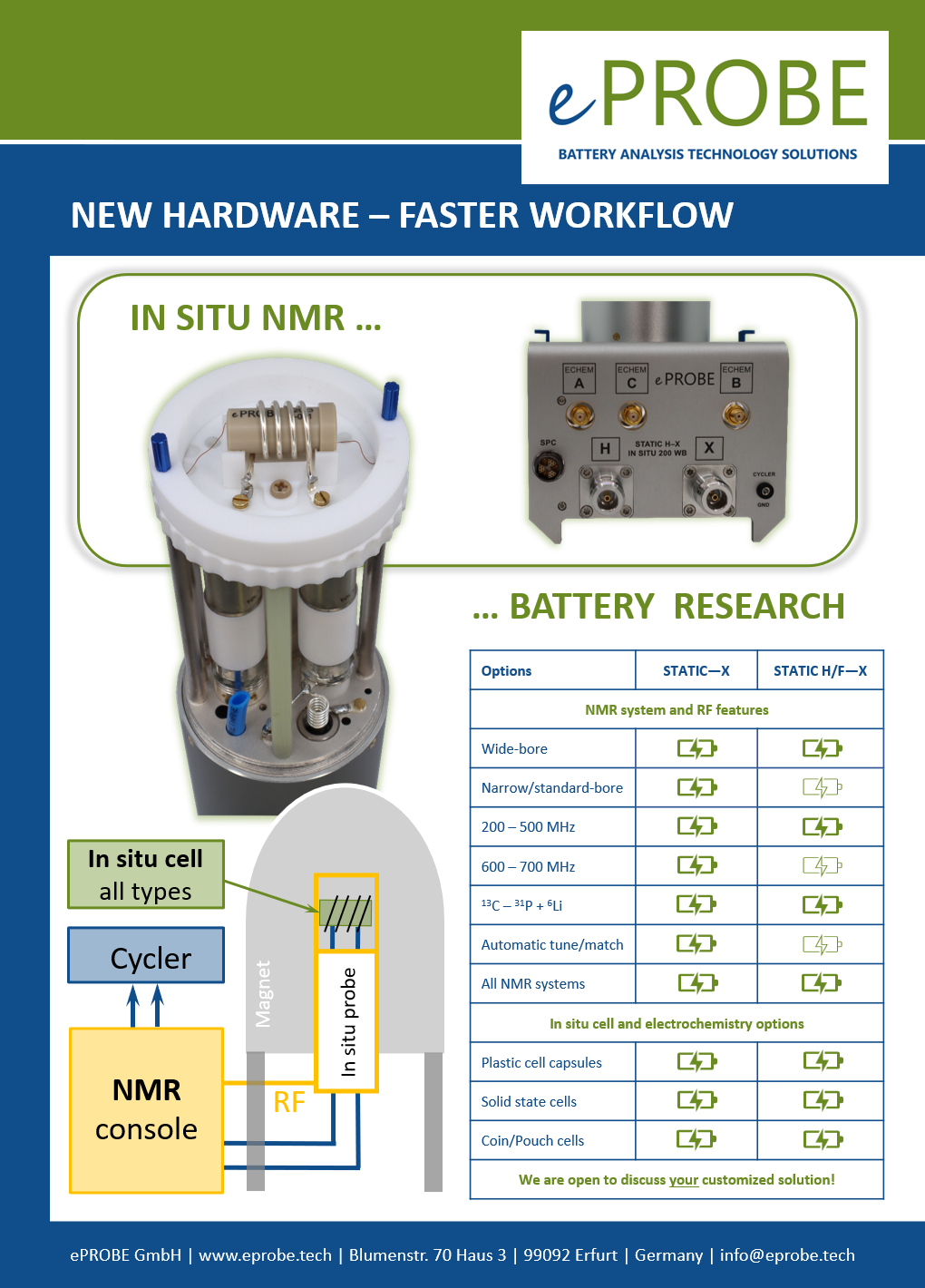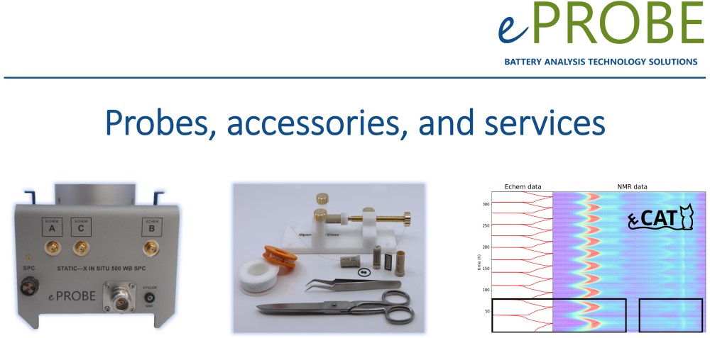 Download the ePROBE Flyer on in situ NMR in battery research here. It summarises the general approach graphically and gives specifications of our single- and double-channel in situ NMR probes.